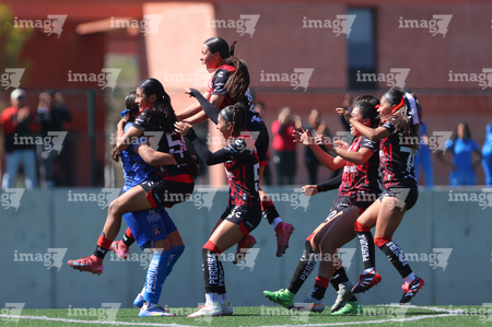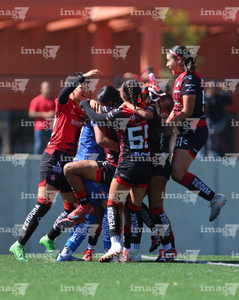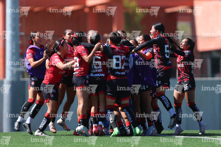Guadalajara, Jalisco, 12 de noviembre de 2025. Jugadoras de Atlas en festejo de gol, durante el partido correspondiente a los Cuartos de Final del torneo Apertura 2025 de la Liga BBVA MX Femenil categoría Sub19, entre las Rojinegras del Atlas y la Máquina Celeste del Cruz Azul, realizado en la Academia AGA. Foto: Imago7/ Juan Carlos Cubeyro.