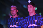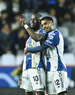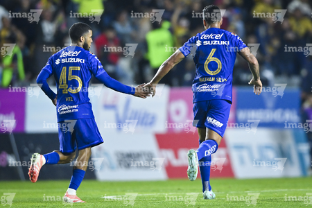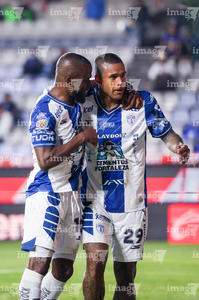 Pachuca, Hidalgo, 20 de noviembre de 2025. Eduardo Bauermann y Robert Kenedy en festejo de gol, durante el partido correspondiente al Play In del torneo Apertura 2025 de la Liga BBVA MX, entre los Tuzos del Pachuca y los Pumas de la UNAM, realizado en el estadio Hidalgo. Foto: Imago7/ Jacqueline Pedraza