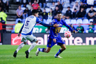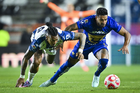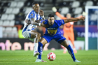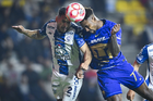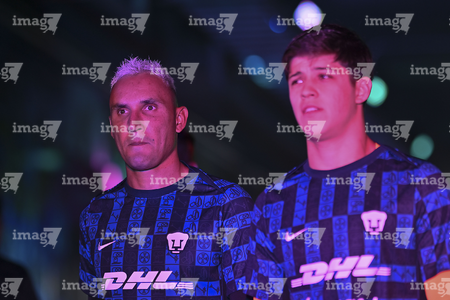 Pachuca, Hidalgo, 20 de noviembre de 2025. Keylor Navas y Jhonder Cádiz durante el partido correspondiente al Play In del torneo Apertura 2025 de la Liga BBVA MX, entre los Tuzos del Pachuca y los Pumas de la UNAM, realizado en el estadio Hidalgo. Foto: Imago7/ Jacqueline Pedraza