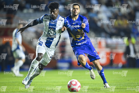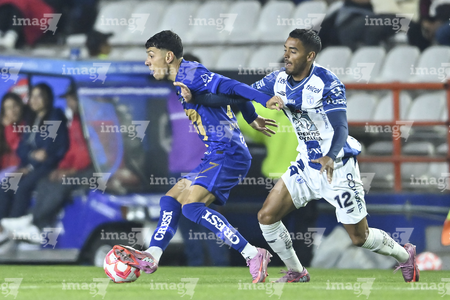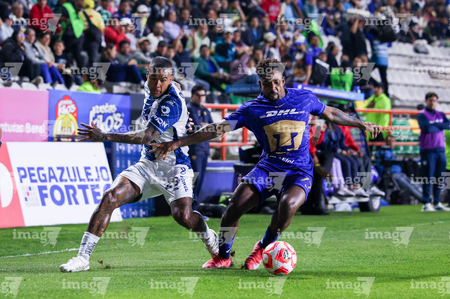 Pachuca, Hidalgo, 20 de noviembre de 2025. Robert Kenedy y Alvaro Angulo, durante el partido correspondiente al Play In del torneo Apertura 2025 de la Liga BBVA MX, entre los Tuzos del Pachuca y los Pumas de la UNAM, realizado en el estadio Hidalgo. Foto: Imago7/ Elizabeth Hernández