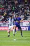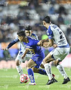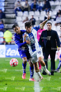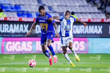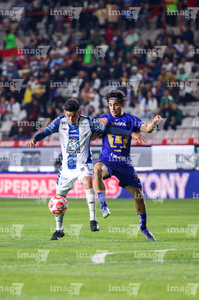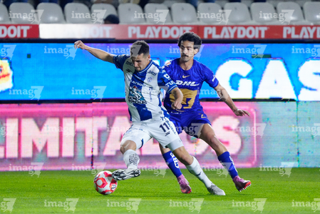 Pachuca, Hidalgo, 20 de noviembre de 2025. Alan Medina y Luis Quiñones, durante el partido correspondiente al Play In del torneo Apertura 2025 de la Liga BBVA MX, entre los Tuzos del Pachuca y los Pumas de la UNAM, realizado en el estadio Hidalgo. Foto: Imago7/ Etzel Espinosa