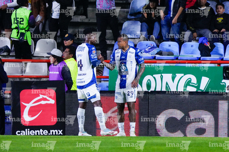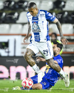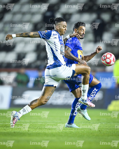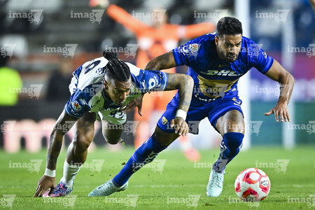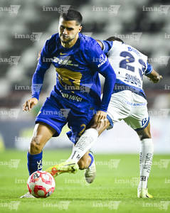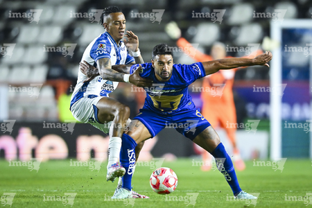 Pachuca, Hidalgo, 20 de noviembre de 2025. José Caicedo y Luis Quiñones, durante el partido correspondiente al Play In del torneo Apertura 2025 de la Liga BBVA MX, entre los Tuzos del Pachuca y los Pumas de la UNAM, realizado en el estadio Hidalgo. Foto: Imago7/ Jacqueline Pedraza