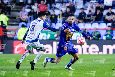 Pachuca, Hidalgo, 20 de noviembre de 2025. Sergio Barreto y Alvaro Angulo, durante el partido correspondiente al Play In del torneo Apertura 2025 de la Liga BBVA MX, entre los Tuzos del Pachuca y los Pumas de la UNAM, realizado en el estadio Hidalgo. Foto: Imago7/ Etzel Espinosa