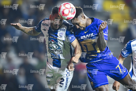 Pachuca, Hidalgo, 20 de noviembre de 2025. Ángel Rico y Alexei Domínguez, durante el partido correspondiente al Play In del torneo Apertura 2025 de la Liga BBVA MX, entre los Tuzos del Pachuca y los Pumas de la UNAM, realizado en el estadio Hidalgo. Foto: Imago7/ Jacqueline Pedraza
