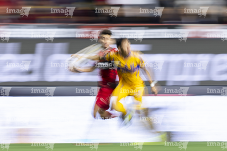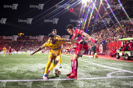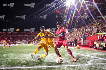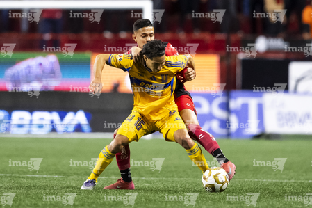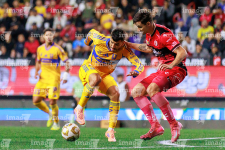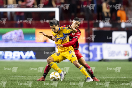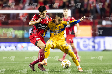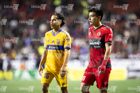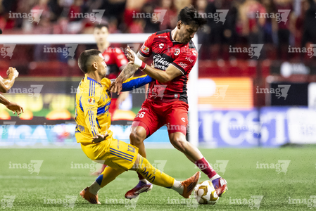 Tijuana, Baja California, 26 de noviembre de 2025. Fernando Gorriarán y Jesús Alejandro Gómez, durante el partido correspondiente a la ida de los Cuartos de Final del torneo Apertura 2025 de la Liga BBVA MX, entre los Xolos de Tijuana y los Tigres de la UANL, realizado en el estadio Caliente. Foto: Imago7/