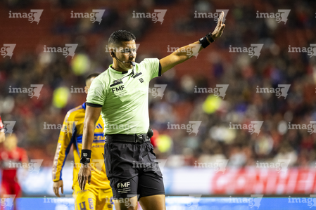 Tijuana, Baja California, 26 de noviembre de 2025. Vicente Jassiel Reynoso, árbitro central, durante el partido correspondiente a la ida de los Cuartos de Final del torneo Apertura 2025 de la Liga BBVA MX, entre los Xolos de Tijuana y los Tigres de la UANL, realizado en el estadio Caliente. Foto: Imago7/
