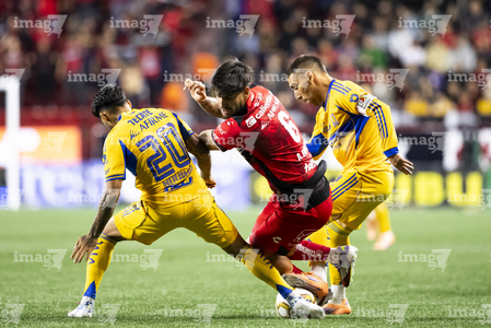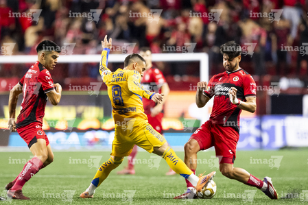 Tijuana, Baja California, 26 de noviembre de 2025. Javier Aquino, Jesús Alejandro Gómez y Fernando Gorriarán, durante el partido correspondiente a la ida de los Cuartos de Final del torneo Apertura 2025 de la Liga BBVA MX, entre los Xolos de Tijuana y los Tigres de la UANL, realizado en el estadio Caliente. Foto: Imago7/Alejandro Gutiérrez Mora