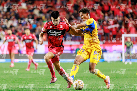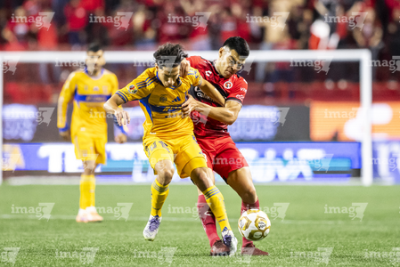 Tijuana, Baja California, 26 de noviembre de 2025. Iván Tona y Ozziel Herrera, durante el partido correspondiente a la ida de los Cuartos de Final del torneo Apertura 2025 de la Liga BBVA MX, entre los Xolos de Tijuana y los Tigres de la UANL, realizado en el estadio Caliente. Foto: Imago7/Agustín Reyes