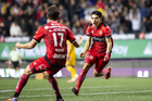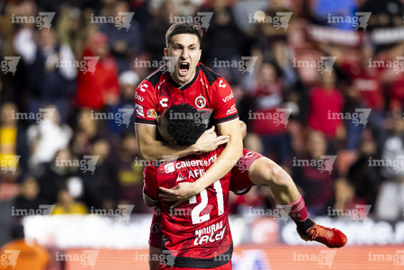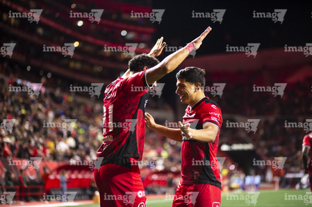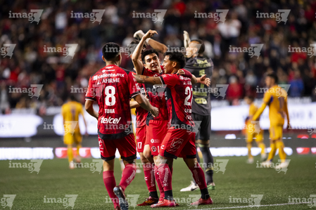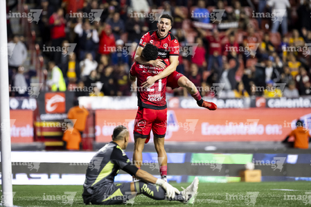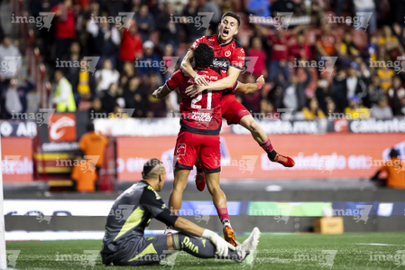 Tijuana, Baja California, 26 de noviembre de 2025. Mourad Daoudi y Rafael Fernández en festejo de gol, durante el partido correspondiente a la ida de los Cuartos de Final del torneo Apertura 2025 de la Liga BBVA MX, entre los Xolos de Tijuana y los Tigres de la UANL, realizado en el estadio Caliente. Foto: Imago7/Alejandro Gutiérrez Mora