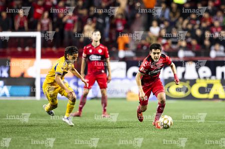 Tijuana, Baja California, 26 de noviembre de 2025. Diego Lainez e Iván Tona, durante el partido correspondiente a la ida de los Cuartos de Final del torneo Apertura 2025 de la Liga BBVA MX, entre los Xolos de Tijuana y los Tigres de la UANL, realizado en el estadio Caliente. Foto: Imago7/Alejandro Gutiérrez Mora