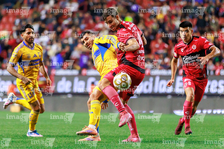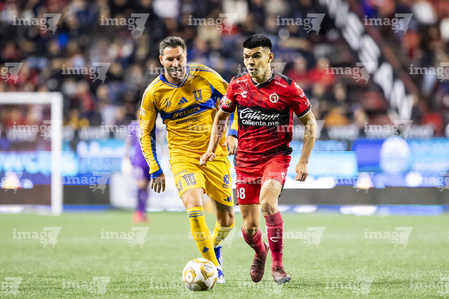 Tijuana, Baja California, 26 de noviembre de 2025. Iván Tona y Fernando Gorriarán, durante el partido correspondiente a la ida de los Cuartos de Final del torneo Apertura 2025 de la Liga BBVA MX, entre los Xolos de Tijuana y los Tigres de la UANL, realizado en el estadio Caliente. Foto: Imago7/