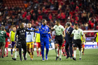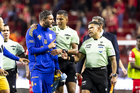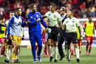 Tijuana, Baja California, 26 de noviembre de 2025. André-Pierre Gignac en reclamo a Vicente Jassiel Reynoso, árbitro central, durante el partido correspondiente a la ida de los Cuartos de Final del torneo Apertura 2025 de la Liga BBVA MX, entre los Xolos de Tijuana y los Tigres de la UANL, realizado en el estadio Caliente. Foto: Imago7/