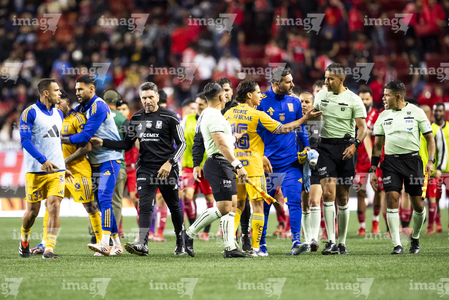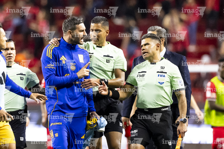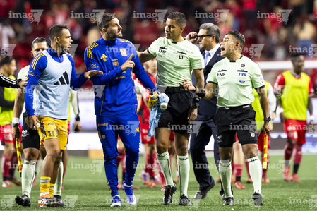 Tijuana, Baja California, 26 de noviembre de 2025. Diego Lainez y André-Pierre Gignac en reclamo a Vicente Jassiel Reynoso, árbitro central, durante el partido correspondiente a la ida de los Cuartos de Final del torneo Apertura 2025 de la Liga BBVA MX, entre los Xolos de Tijuana y los Tigres de la UANL, realizado en el estadio Caliente. Foto: Imago7/