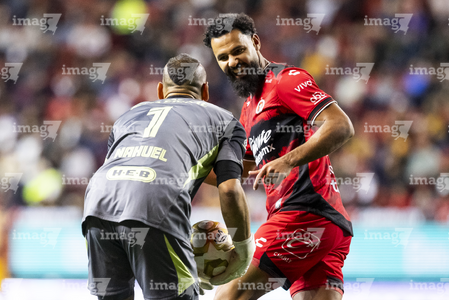 Tijuana, Baja California, 26 de noviembre de 2025. Nahuel Guzmán y Mourad Daoudi, durante el partido correspondiente a la ida de los Cuartos de Final del torneo Apertura 2025 de la Liga BBVA MX, entre los Xolos de Tijuana y los Tigres de la UANL, realizado en el estadio Caliente. Foto: Imago7/