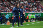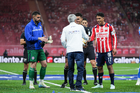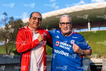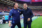 Zapopan, Jalisco, 27 de noviembre de 2025. Gabriel Milito, director técnico y Nicolás Larcamón, director técnico, durante el partido correspondiente a la ida de los Cuartos de Final del torneo Apertura 2025 de la Liga BBVA MX, entre las Chivas Rayadas del Guadalajara y la Máquina Celeste del Cruz Azul, realizado en el estadio Akron. Foto: Imago7/ Juan Carlos Cubeyro.