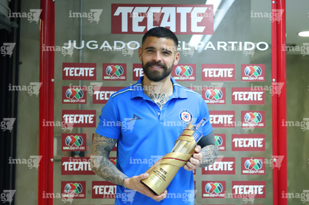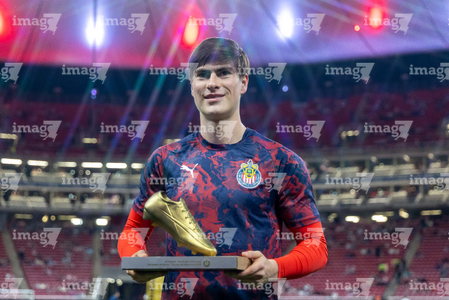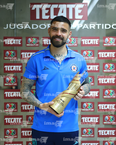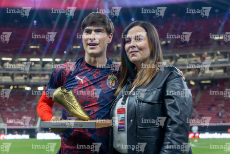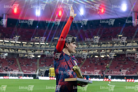 Zapopan, Jalisco, 27 de noviembre de 2025. Andrés Gudiño recibió el trofeo Tecate al jugador del partido, durante el partido correspondiente a la ida de los Cuartos de Final del torneo Apertura 2025 de la Liga BBVA MX, entre las Chivas Rayadas del Guadalajara y la Máquina Celeste del Cruz Azul, realizado en el estadio Akron. Foto: Imago7/ Juan Carlos Cubeyro.