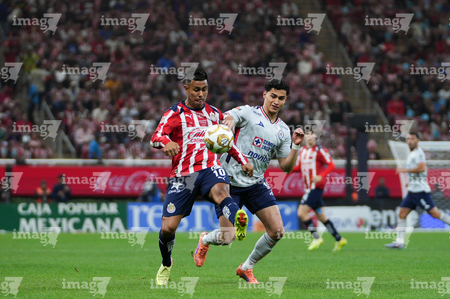 Zapopan, Jalisco, 27 de noviembre de 2025. Bryan González y Carlos Rodríguez, durante el partido correspondiente a la ida de los Cuartos de Final del torneo Apertura 2025 de la Liga BBVA MX, entre las Chivas Rayadas del Guadalajara y la Máquina Celeste del Cruz Azul, realizado en el estadio Akron. Foto: Imago7/ Hugo Ramirez