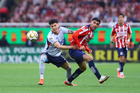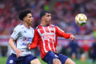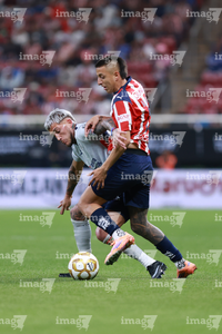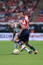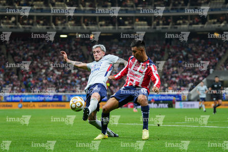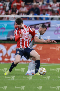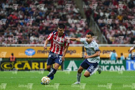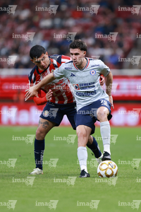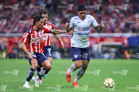 Zapopan, Jalisco, 27 de noviembre de 2025. Daniel Aguirre y Carlos Rodríguez, durante el partido correspondiente a la ida de los Cuartos de Final del torneo Apertura 2025 de la Liga BBVA MX, entre las Chivas Rayadas del Guadalajara y la Máquina Celeste del Cruz Azul, realizado en el estadio Akron. Foto: Imago7/ Hugo Ramirez