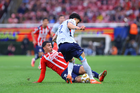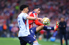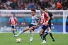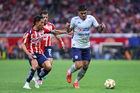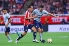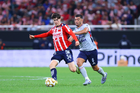 Zapopan, Jalisco, 27 de noviembre de 2025. Gonzalo Piovi y Efraín Álvarez, durante el partido correspondiente a la ida de los Cuartos de Final del torneo Apertura 2025 de la Liga BBVA MX, entre las Chivas Rayadas del Guadalajara y la Máquina Celeste del Cruz Azul, realizado en el estadio Akron. Foto: Imago7/ Hugo Ramirez