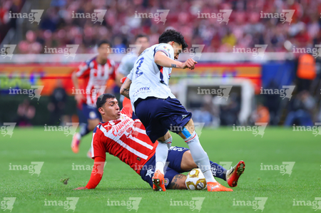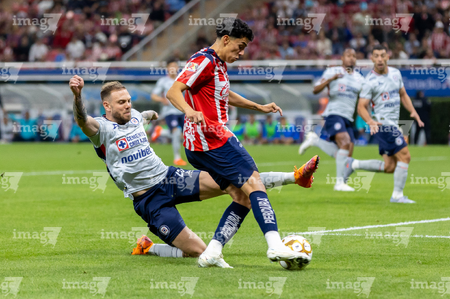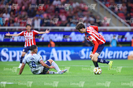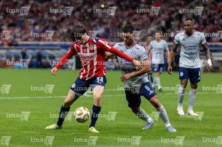 Zapopan, Jalisco, 27 de noviembre de 2025. Jeremy Márquez y Bryan González, durante el partido correspondiente a la ida de los Cuartos de Final del torneo Apertura 2025 de la Liga BBVA MX, entre las Chivas Rayadas del Guadalajara y la Máquina Celeste del Cruz Azul, realizado en el estadio Akron. Foto: Imago7/ Juan Carlos Cubeyro.
