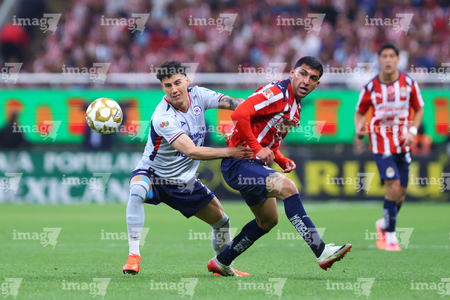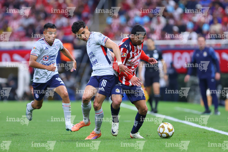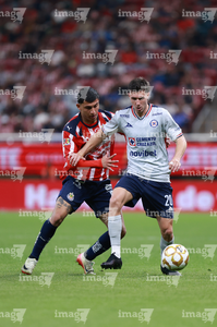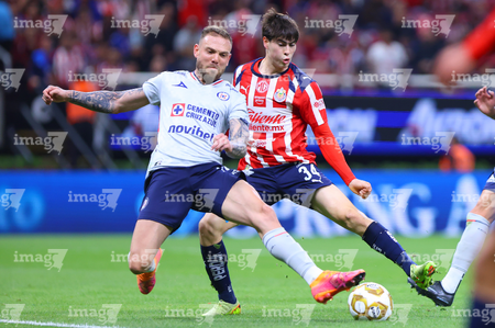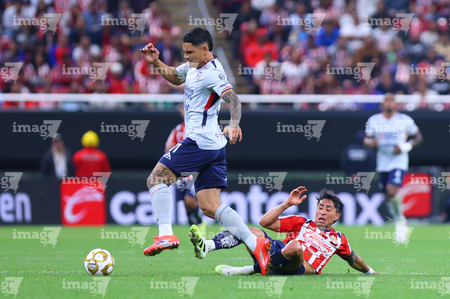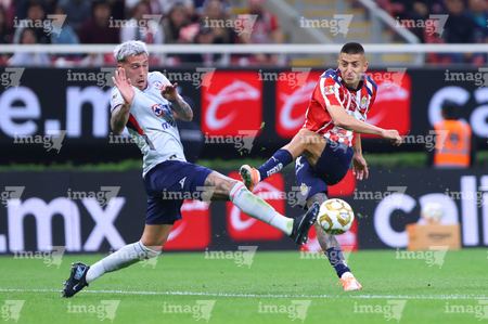 Zapopan, Jalisco, 27 de noviembre de 2025. Carlos Rodríguez y Omar Govea, durante el partido correspondiente a la ida de los Cuartos de Final del torneo Apertura 2025 de la Liga BBVA MX, entre las Chivas Rayadas del Guadalajara y la Máquina Celeste del Cruz Azul, realizado en el estadio Akron. Foto: Imago7/Cristian Hernandez