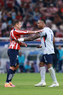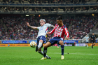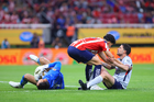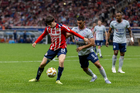 Zapopan, Jalisco, 27 de noviembre de 2025. Javier Hernández "Chicharito" y Willer Ditta, durante el partido correspondiente a la ida de los Cuartos de Final del torneo Apertura 2025 de la Liga BBVA MX, entre las Chivas Rayadas del Guadalajara y la Máquina Celeste del Cruz Azul, realizado en el estadio Akron. Foto: Imago7/Cristian Hernandez