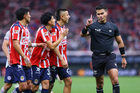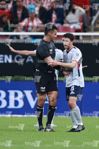 Zapopan, Jalisco, 27 de noviembre de 2025. Jugadores de Chivas en reclamo a Guillermo Pacheco Larios, árbitro central, durante el partido correspondiente a la ida de los Cuartos de Final del torneo Apertura 2025 de la Liga BBVA MX, entre las Chivas Rayadas del Guadalajara y la Máquina Celeste del Cruz Azul, realizado en el estadio Akron. Foto: Imago7/ Juan Carlos Cubeyro.