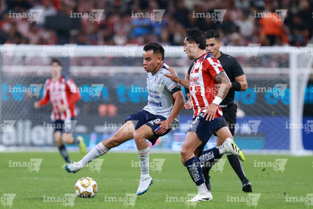 Zapopan, Jalisco, 27 de noviembre de 2025. Armando González y Erik Lira, durante el partido correspondiente a la ida de los Cuartos de Final del torneo Apertura 2025 de la Liga BBVA MX, entre las Chivas Rayadas del Guadalajara y la Máquina Celeste del Cruz Azul, realizado en el estadio Akron. Foto: Imago7/ Jair Terán