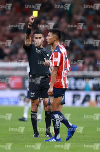 Zapopan, Jalisco, 27 de noviembre de 2025. Guillermo Pacheco Larios, árbitro central muestra tarjeta amarilla de amonestación a Willer Ditta, durante el partido correspondiente a la ida de los Cuartos de Final del torneo Apertura 2025 de la Liga BBVA MX, entre las Chivas Rayadas del Guadalajara y la Máquina Celeste del Cruz Azul, realizado en el estadio Akron. Foto: Imago7/Cristian Hernandez