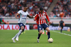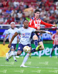 Zapopan, Jalisco, 27 de noviembre de 2025. Efraín Álvarez y Jeremy Márquez, durante el partido correspondiente a la ida de los Cuartos de Final del torneo Apertura 2025 de la Liga BBVA MX, entre las Chivas Rayadas del Guadalajara y la Máquina Celeste del Cruz Azul, realizado en el estadio Akron. Foto: Imago7/ Hugo Ramirez