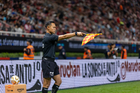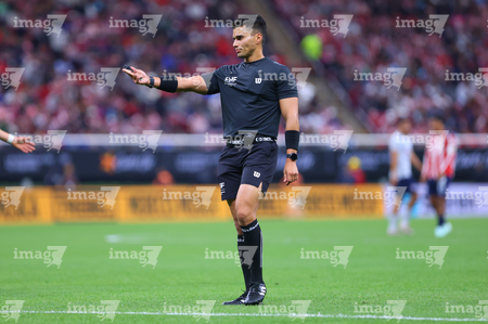 Zapopan, Jalisco, 27 de noviembre de 2025. Guillermo Pacheco Larios, árbitro central, durante el partido correspondiente a la ida de los Cuartos de Final del torneo Apertura 2025 de la Liga BBVA MX, entre las Chivas Rayadas del Guadalajara y la Máquina Celeste del Cruz Azul, realizado en el estadio Akron. Foto: Imago7/ Juan Carlos Cubeyro.