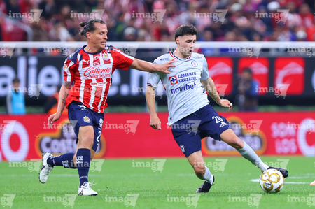 Zapopan, Jalisco, 27 de noviembre de 2025. Richard Ledezma y Rodolfo Rotondi, durante el partido correspondiente a la ida de los Cuartos de Final del torneo Apertura 2025 de la Liga BBVA MX, entre las Chivas Rayadas del Guadalajara y la Máquina Celeste del Cruz Azul, realizado en el estadio Akron. Foto: Imago7/ Juan Carlos Cubeyro.