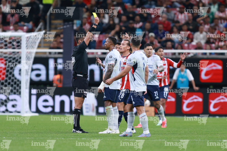 Zapopan, Jalisco, 27 de noviembre de 2025. Guillermo Pacheco Larios, árbitro central muestra tarjeta amarilla de amonestación a Daniel Aguirre, durante el partido correspondiente a la ida de los Cuartos de Final del torneo Apertura 2025 de la Liga BBVA MX, entre las Chivas Rayadas del Guadalajara y la Máquina Celeste del Cruz Azul, realizado en el estadio Akron. Foto: Imago7/Cristian Hernandez