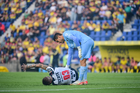 Ciudad de México, 29 de noviembre de 2025. Sergio Ramos resultó lesionado, durante el partido correspondiente a la vuelta de los Cuartos de Final del torneo Apertura 2025 de la Liga BBVA MX, entre las Águilas del América y los Rayados de Monterrey, realizado en el estadio Ciudad de los Deportes. Foto: Imago7/Diego Padilla