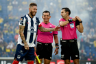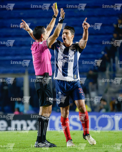Ciudad de México, 29 de noviembre de 2025. John Medina en reclamo a César Arturo Ramos Palazuelos, árbitro central, durante el partido correspondiente a la vuelta de los Cuartos de Final del torneo Apertura 2025 de la Liga BBVA MX, entre las Águilas del América y los Rayados de Monterrey, realizado en el estadio Ciudad de los Deportes. Foto: Imago7/Diego Padilla