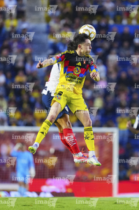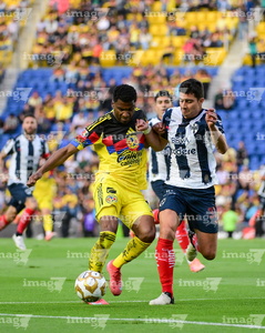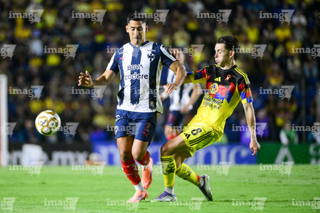 Ciudad de México, 29 de noviembre de 2025. Rodrigo Aguirre y John Medina, durante el partido correspondiente a la vuelta de los Cuartos de Final del torneo Apertura 2025 de la Liga BBVA MX, entre las Águilas del América y los Rayados de Monterrey, realizado en el estadio Ciudad de los Deportes. Foto: Imago7/ Alexis Chavez