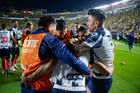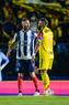 Ciudad de México, 29 de noviembre de 2025. Sergio Ramos y Rodrigo Aguirre en conato de bronca, durante el partido correspondiente a la vuelta de los Cuartos de Final del torneo Apertura 2025 de la Liga BBVA MX, entre las Águilas del América y los Rayados de Monterrey, realizado en el estadio Ciudad de los Deportes. Foto: Imago7/Diego Padilla