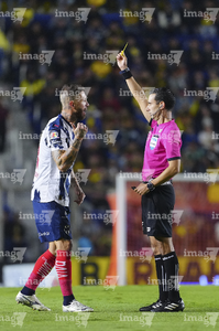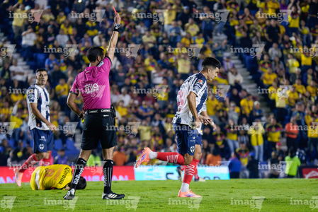 Ciudad de México, 29 de noviembre de 2025. César Arturo Ramos Palazuelos, árbitro central muestra tarjeta amarilla de amonestación a Israel Reyes, durante el partido correspondiente a la vuelta de los Cuartos de Final del torneo Apertura 2025 de la Liga BBVA MX, entre las Águilas del América y los Rayados de Monterrey, realizado en el estadio Ciudad de los Deportes. Foto: Imago7/Diego Padilla