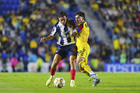 Ciudad de México, 29 de noviembre de 2025. Iker Fimbres y Alejandro Zendejas, durante el partido correspondiente a la vuelta de los Cuartos de Final del torneo Apertura 2025 de la Liga BBVA MX, entre las Águilas del América y los Rayados de Monterrey, realizado en el estadio Ciudad de los Deportes. Foto: Imago7/ Manlio Contreras