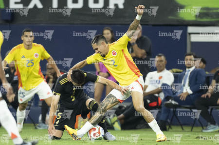 Arlington, Texas, Estados Unidos, 11 de octubre de 2025. Jorge Sánchez y Willer Ditta, durante un partido amistoso del MEXTOUR 2025, entre la Selección Nacional de México y la Selección de Colombia, celebrado en el AT&T Stadium. Foto: Imago7/ Etzel Espinosa