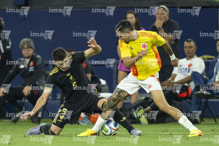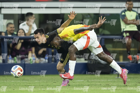 Arlington, Texas, Estados Unidos, 11 de octubre de 2025. Rafael Santos Borré y Jesús Gallardo, durante un partido amistoso del MEXTOUR 2025, entre la Selección Nacional de México y la Selección de Colombia, celebrado en el AT&T Stadium. Foto: Imago7/ Etzel Espinosa