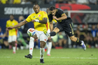 Arlington, Texas, Estados Unidos, 11 de octubre de 2025. Willer Ditta y Hirving Lozano "Chucky", durante un partido amistoso del MEXTOUR 2025, entre la Selección Nacional de México y la Selección de Colombia, celebrado en el AT&T Stadium. Foto: Imago7/ Etzel Espinosa