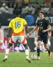 Arlington, Texas, Estados Unidos, 11 de octubre de 2025. Diego Lainez y Kevin Castaño, durante un partido amistoso del MEXTOUR 2025, entre la Selección Nacional de México y la Selección de Colombia, celebrado en el AT&T Stadium. Foto: Imago7/ Etzel Espinosa