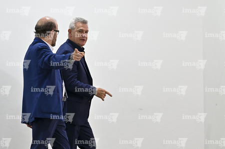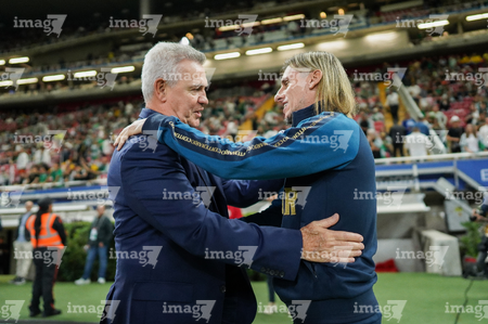 Zapopan, Jalisco, 14 de octubre de 2025. Javier Aguirre, director técnico y Sebastiánn Beccacece, director técnico, durante un partido amistoso del MEXTOUR 2025, entre la Selección Nacional de México y la Selección de Ecuador, realizado en el estadio Akron. Foto: Imago7/