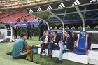 Zapopan, Jalisco, 14 de octubre de 2025. Luis Romo, Andrés Guardado y Jorge Campos, durante un partido amistoso del MEXTOUR 2025, entre la Selección Nacional de México y la Selección de Ecuador, realizado en el estadio Akron. Foto: Imago7/Etzel Espinosa