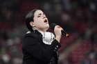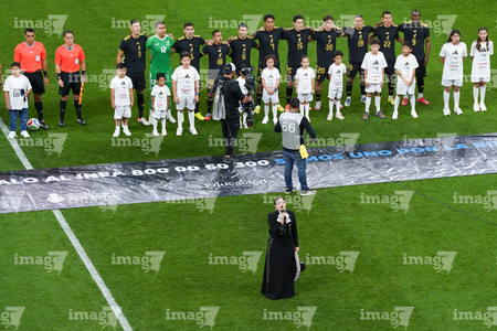 Zapopan, Jalisco, 14 de octubre de 2025. Camila Fernández entonó el himno nacional mexicano, durante un partido amistoso del MEXTOUR 2025, entre la Selección Nacional de México y la Selección de Ecuador, realizado en el estadio Akron. Foto: Imago7/