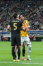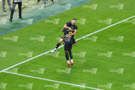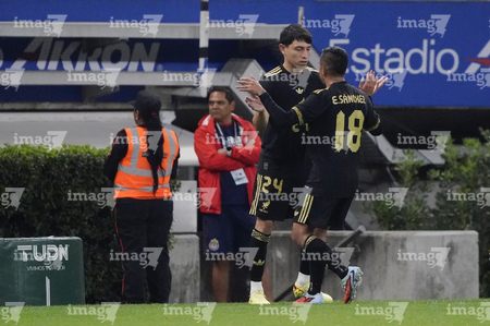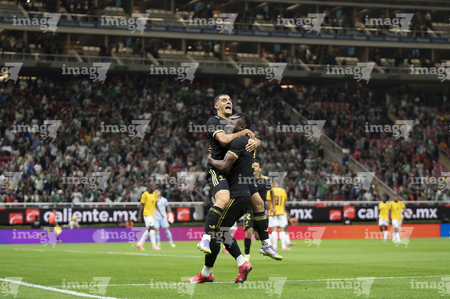 Zapopan, Jalisco, 14 de octubre de 2025. Julián Quiñones y Germán Berterame en festejo de gol, durante un partido amistoso del MEXTOUR 2025, entre la Selección Nacional de México y la Selección de Ecuador, realizado en el estadio Akron. Foto: Imago7/