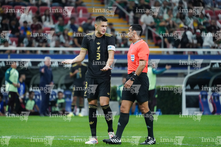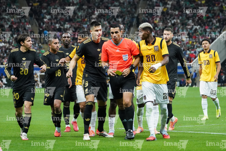 Zapopan, Jalisco, 14 de octubre de 2025. César Montes "Cachorro", Juan Gabriel Calderón, árbitro central y Nilson Angulo, durante un partido amistoso del MEXTOUR 2025, entre la Selección Nacional de México y la Selección de Ecuador, realizado en el estadio Akron. Foto: Imago7/