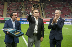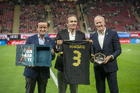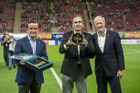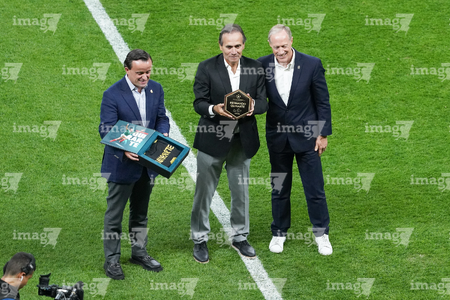 Zapopan, Jalisco, 14 de octubre de 2025. Mikel Arriola e Ivar Sisniega entregaron un reconocimiento a Fernando Quirarte, durante un partido amistoso del MEXTOUR 2025, entre la Selección Nacional de México y la Selección de Ecuador, realizado en el estadio Akron. Foto: Imago7/Etzel Espinosa