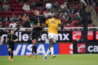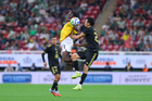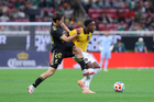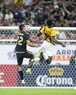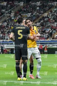 Zapopan, Jalisco, 14 de octubre de 2025. Jordy Alcívar y Julián Quiñones, durante un partido amistoso del MEXTOUR 2025, entre la Selección Nacional de México y la Selección de Ecuador, realizado en el estadio Akron. Foto: Imago7/ Hugo Ramirez